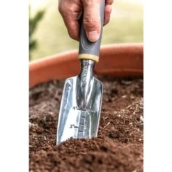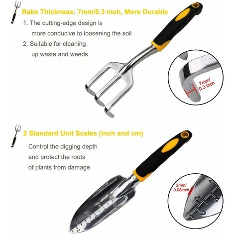 DIMENSIONS: longueur de la pelle de transplantation 30 cm / 11,8 pouces, largeur 7,5 cm / 2,95 pouces, longueur de la pelle à l’échelle 29,5 cm / 11,6 pouces, largeur 5,4 cm / 2,1 pouces, longueur du râteau 29 cm / 11,4 pouces, largeur 7,2 cm / 2,83 pouces,