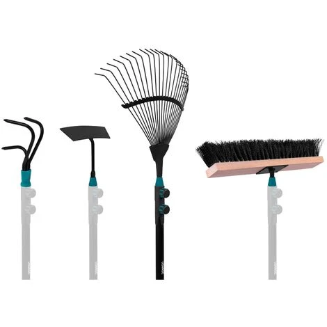 Le cultivateur permet d’ameublir et d’aérer le sol. Utilisez la binette pour retirer les mauvaises herbes fines et casser les mottes de terre. Ramassez facilement toutes les feuilles et les résidus de tonte avec le râteau à feuilles. Le balai avec ses solides poils synthétiques est idéal pour balayer le sable et les feuilles. Tous les outils sont en acier poudré, idéalement protégés contre la corrosion. Le manche léger en aluminium s’adapte très bien à votre main et sa longueur de 130cm est très confortable.