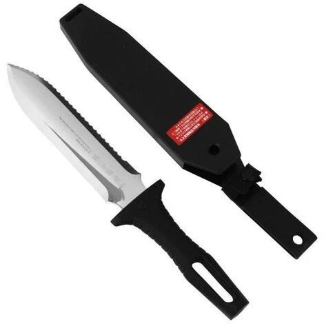 Un croisement entre un couteau et un transplantoir, avec lame dentelé, qui permet d’accomplir plusieurs tâches, comme planter ou transplanter, arracher des racines ou des mauvaises herbes à racines profondes, diviser des vivaces, etc.