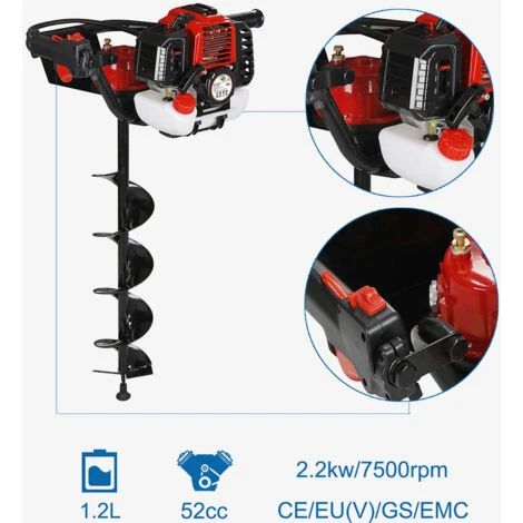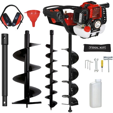 Creusez n’importe quel type de sol avec cette tarière thermique et ses trois mèches. Son moteur de 52 cm3 est polyvalent et décuple assez de puissance pour un forage précis. Robuste et fonctionnelle avec sa poignée ergonomique en mousse, la tarière thermique vous apporte du confort pendant votre travail, et vous aide à creuser des trous de différentes tailles, pour planter arbres, barrières et poteaux. La tarière est livrée avec trois mèches mesurant 100, 150, et 200 mm, ainsi q’une extension de 60 cm, un sac à outils, des gants, et un petit réservoir de mélange.