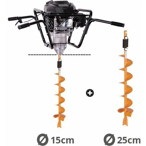 Les 2 guidons permettent de travailler à une ou deux personnes suivant la difficulté et les contraintes du terrain. 5 vrilles sont disponibles en accessoire pour percer des trous d’un diamètre de 10 à 35 cm.