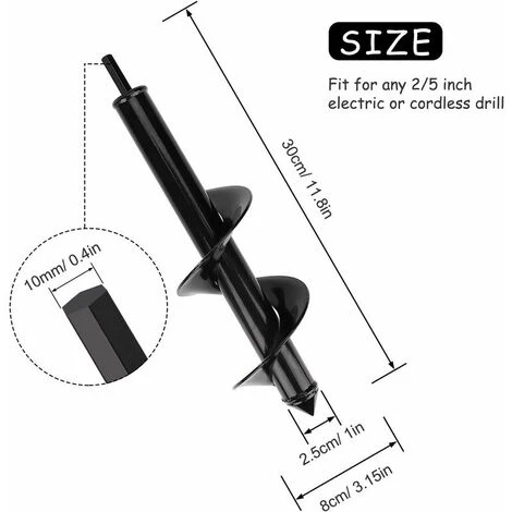 - ?Taille du semoir en spirale ? Ampoule de 8 cm de diamètre x 30 cm de longueur (3,1″ x 11,8″) avec entraînement hexagonal antidérapant, fonctionne avec un foret de 10 mm (3/8″) ou plus.